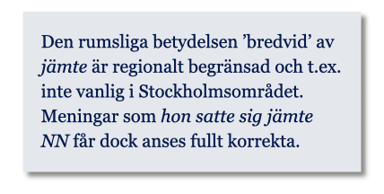 Användningen av jämte i stället för bredvid är alltså dialektal och därför regionalt begränsad. SO ger följande förklaring: