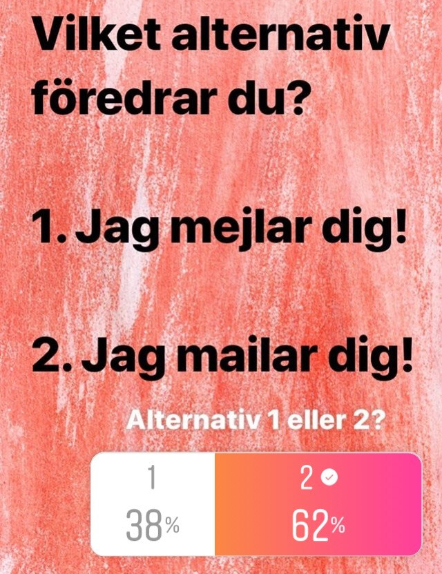 I går frågade jag mina följare på Instagram om de föredrar att skriva mejla framför maila. Så blev resultatet: