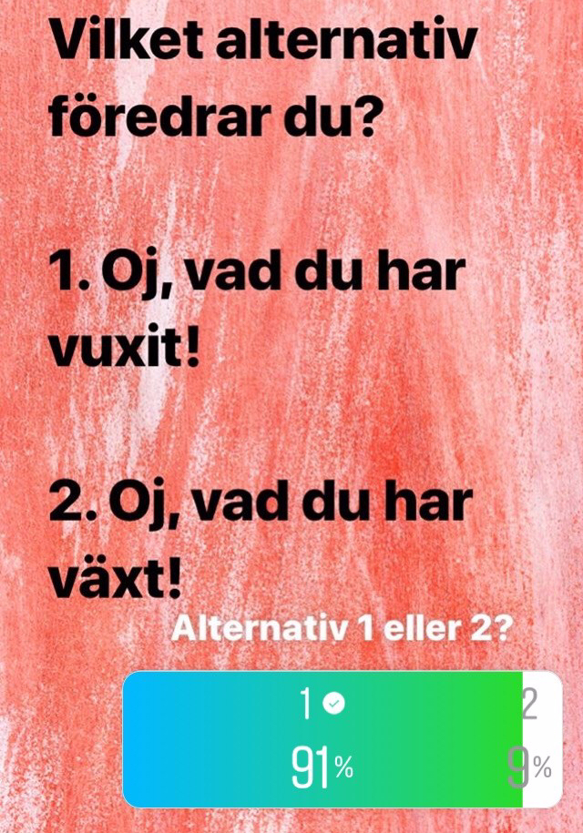 I går frågade jag mina följare på Instagram om de föredrar att använda supinumformen vuxit framför växt. Så här blev resultatet: