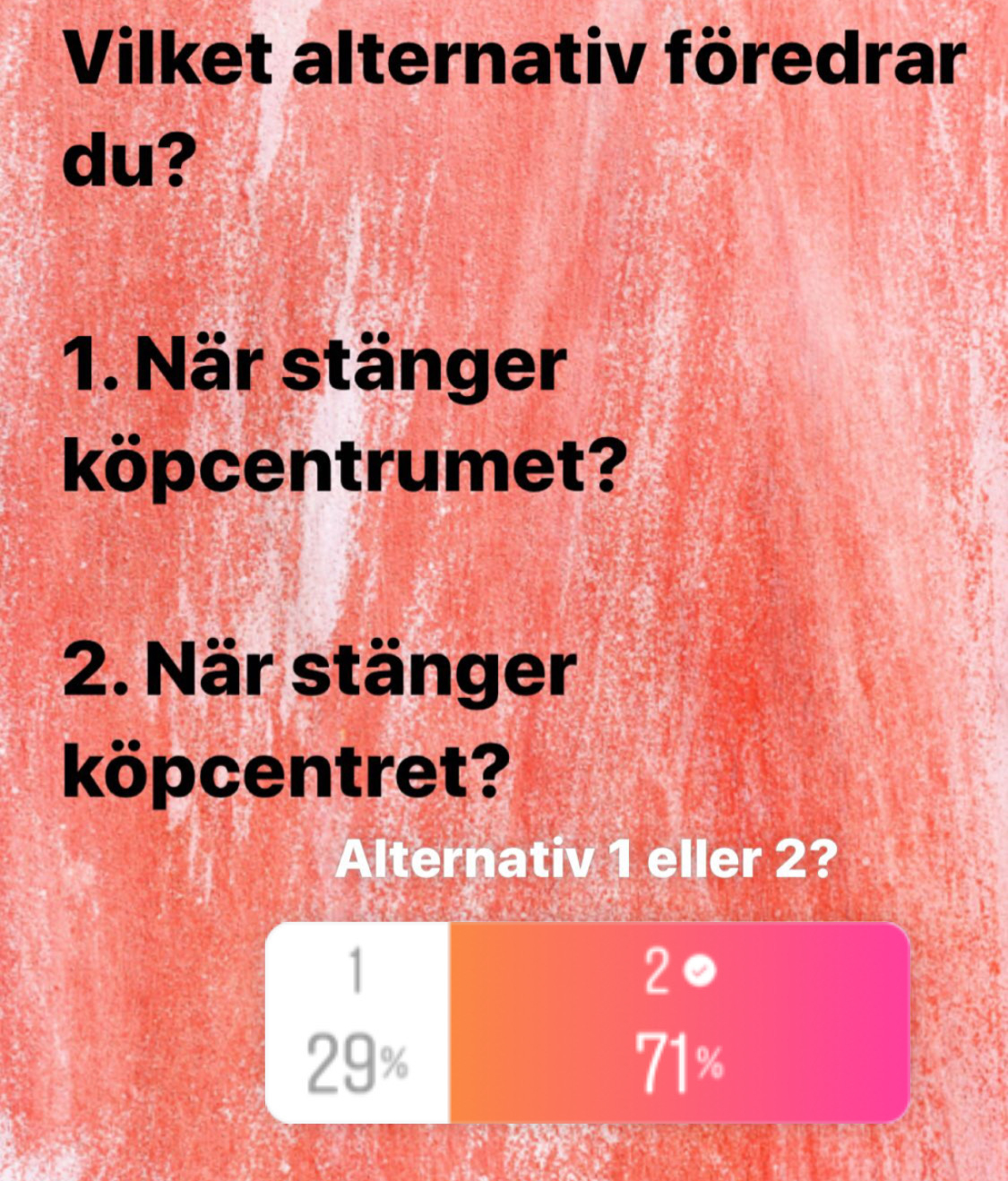 I går frågade jag mina följare på Instagram om de föredrar köpcentrumet framför köpcentret. Så här blev resultatet: