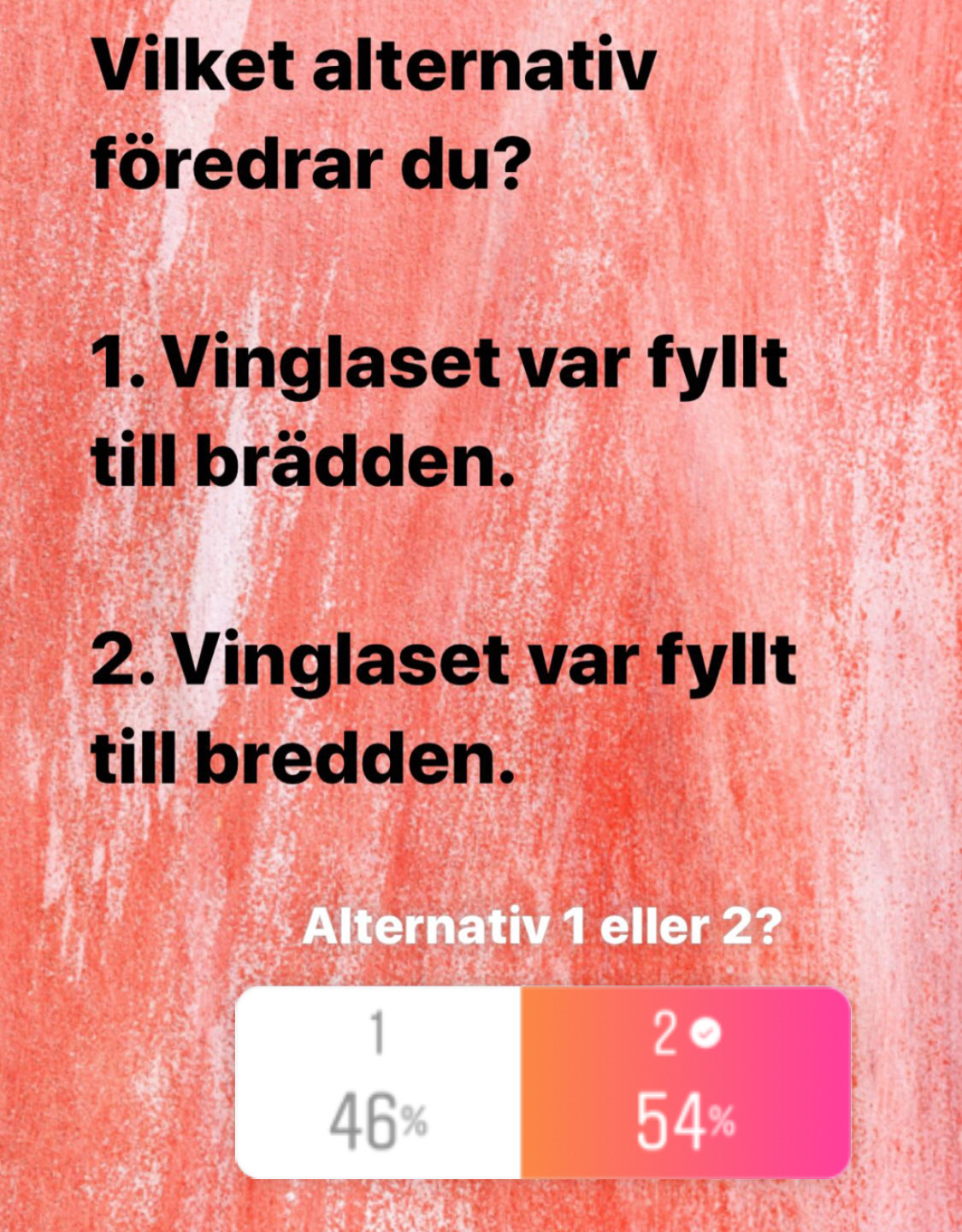 I går frågade jag mina följare på Instagram om de föredrar att skriva att ett glas är fyllt till brädden eller bredden. Så här blev resultatet: