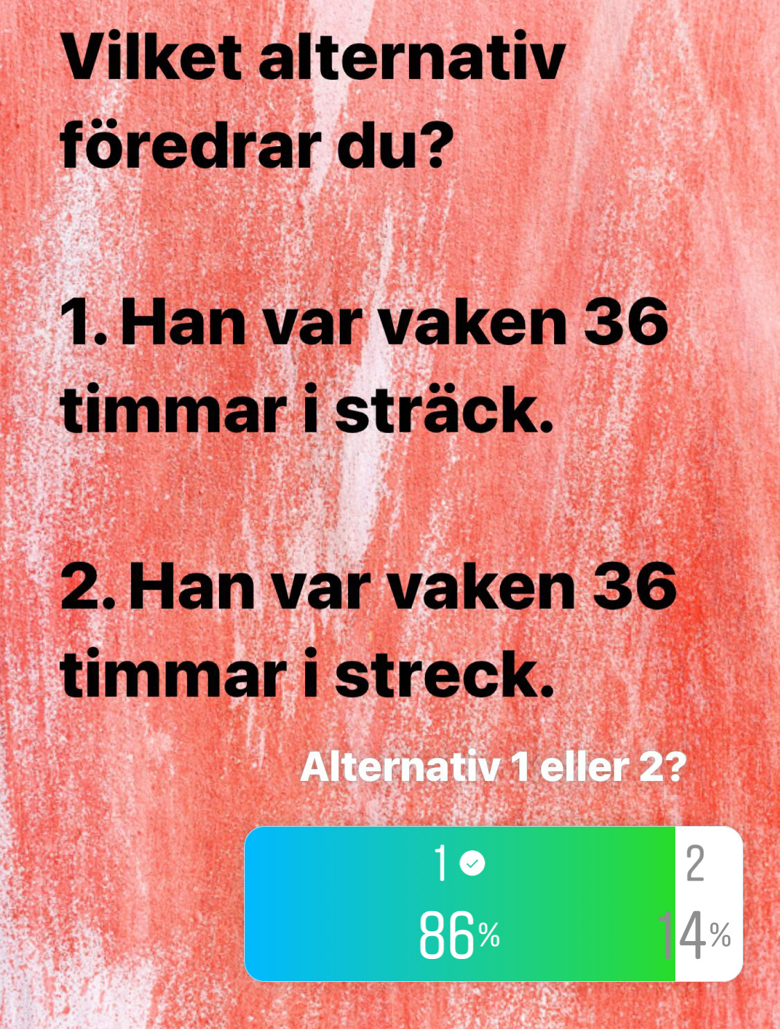 I går frågade jag mina följare på Instagram om de föredrar att skriva att någon är vaken ett visst antal timmar i sträck eller i streck. Så här blev resultatet: