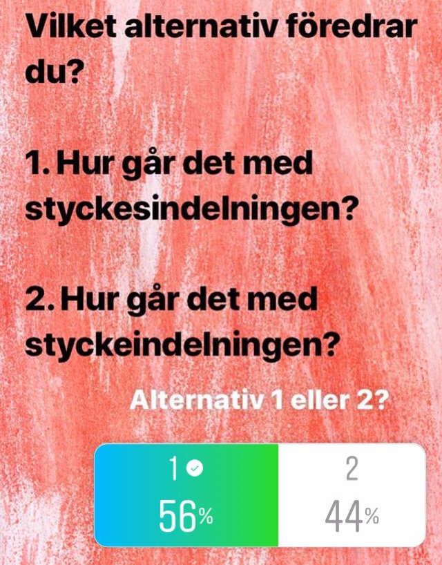 I går frågade jag mina följare på Instagram om de föredrar att skriva styckesindelning framför styckeindelning. Så här blev resultatet: