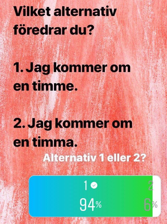 I går frågade jag mina följare på Instagram om de föredrar att skriva timme eller timma. Så här blev resultatet: