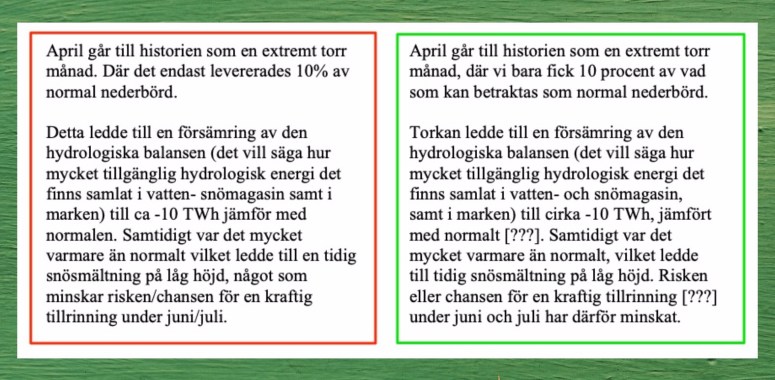 Tips! När du skriver en facktext som riktar sig till personer som inte är lika insatta i ditt område som du är, är det viktigt att förklara ämnesspecifika termer och uttryck. För att undvika att störa flödet kan du till exempel ha en faktaruta i nära anslutning till texten. Där kan du förklara några av begreppen du tar upp eller komplettera den befintliga informationen med ytterligare uppgifter. I det här fallet skulle man kunna nämna vad normala hydrologiska energinivåer är och vad ”tillrinning” betyder i den här kontexten.